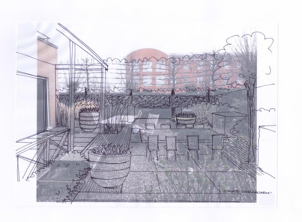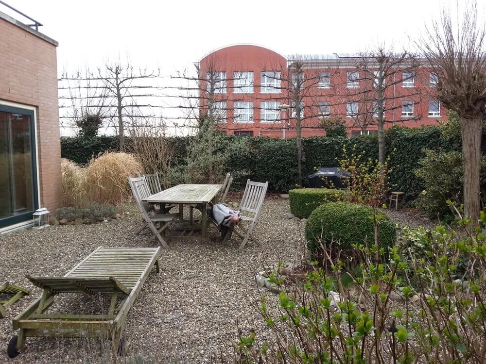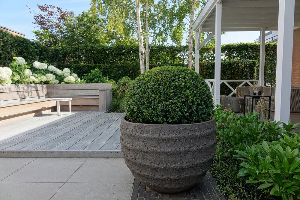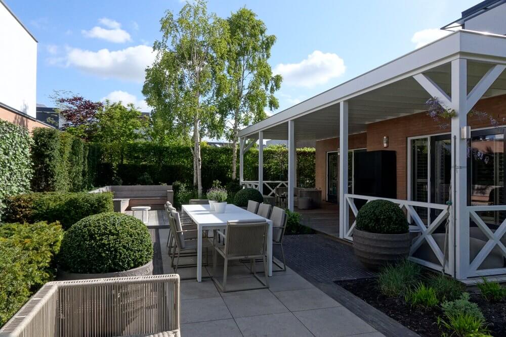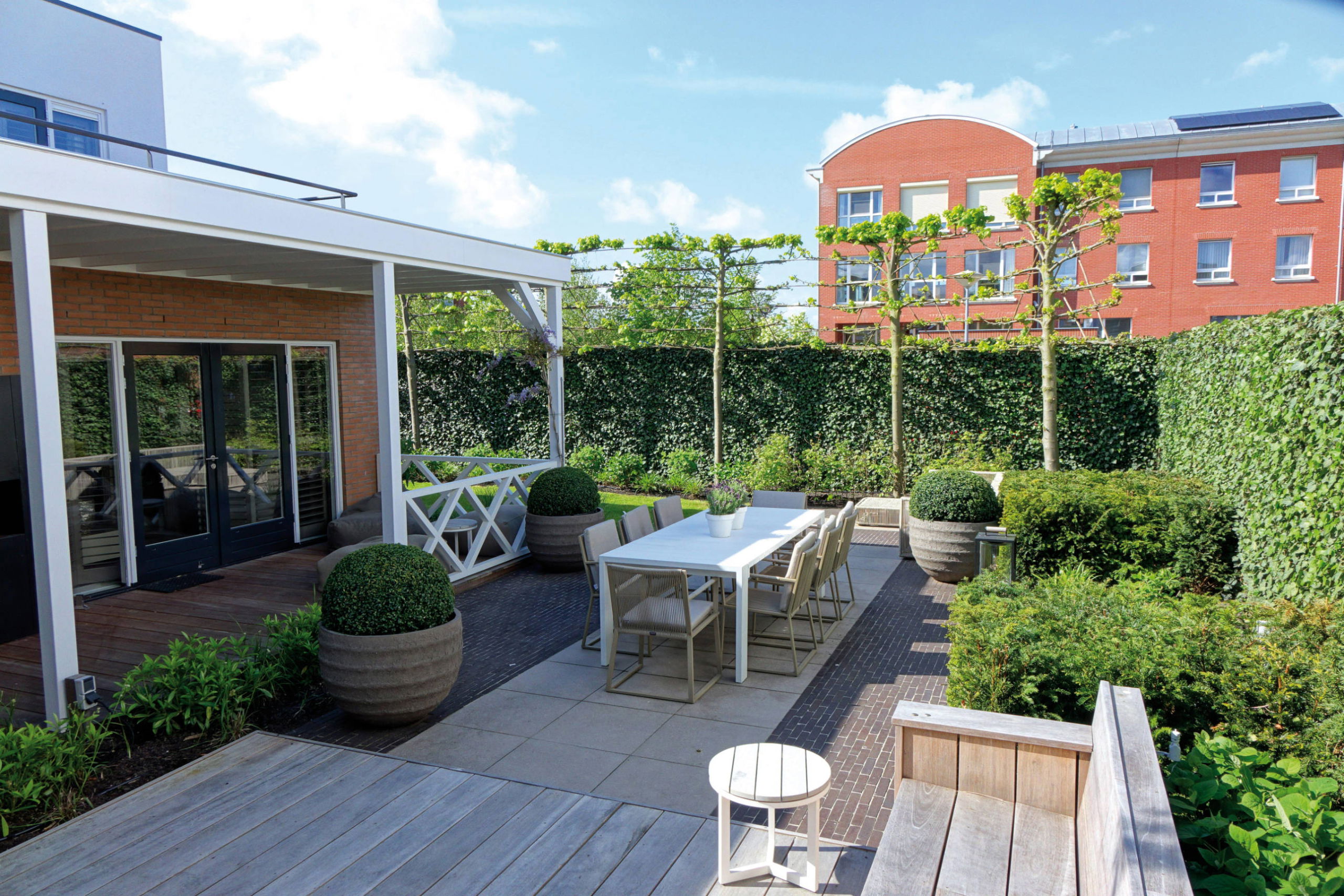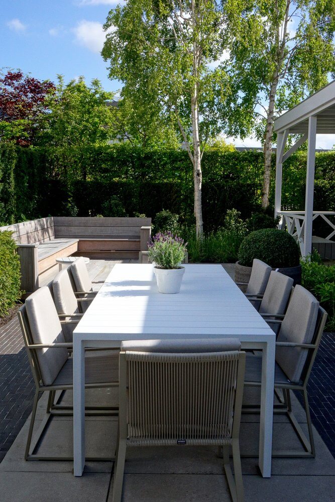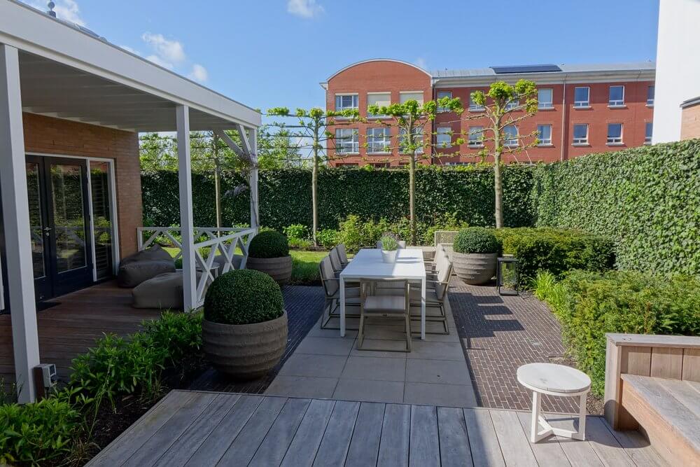 Onze tuinontwerpster creëert vaker hoogteverschil, ook al is het maar 15 centimeter. In deze tuin is het vlonderdek ‘gelift’ naar dezelfde hoogte als de verandavloer. Dit nodigt direct uit om naar buiten te lopen. De looproute van de keuken naar de ‘chillplek’ is precies in de middenlijn van de keukendeur ingetekend zodat alle lijnen kloppen. Een tapijt van tegels op de klinkervloer vormt een (visuele) loper waarop in het midden tussen de pui en de schutting de tuintafel staat.