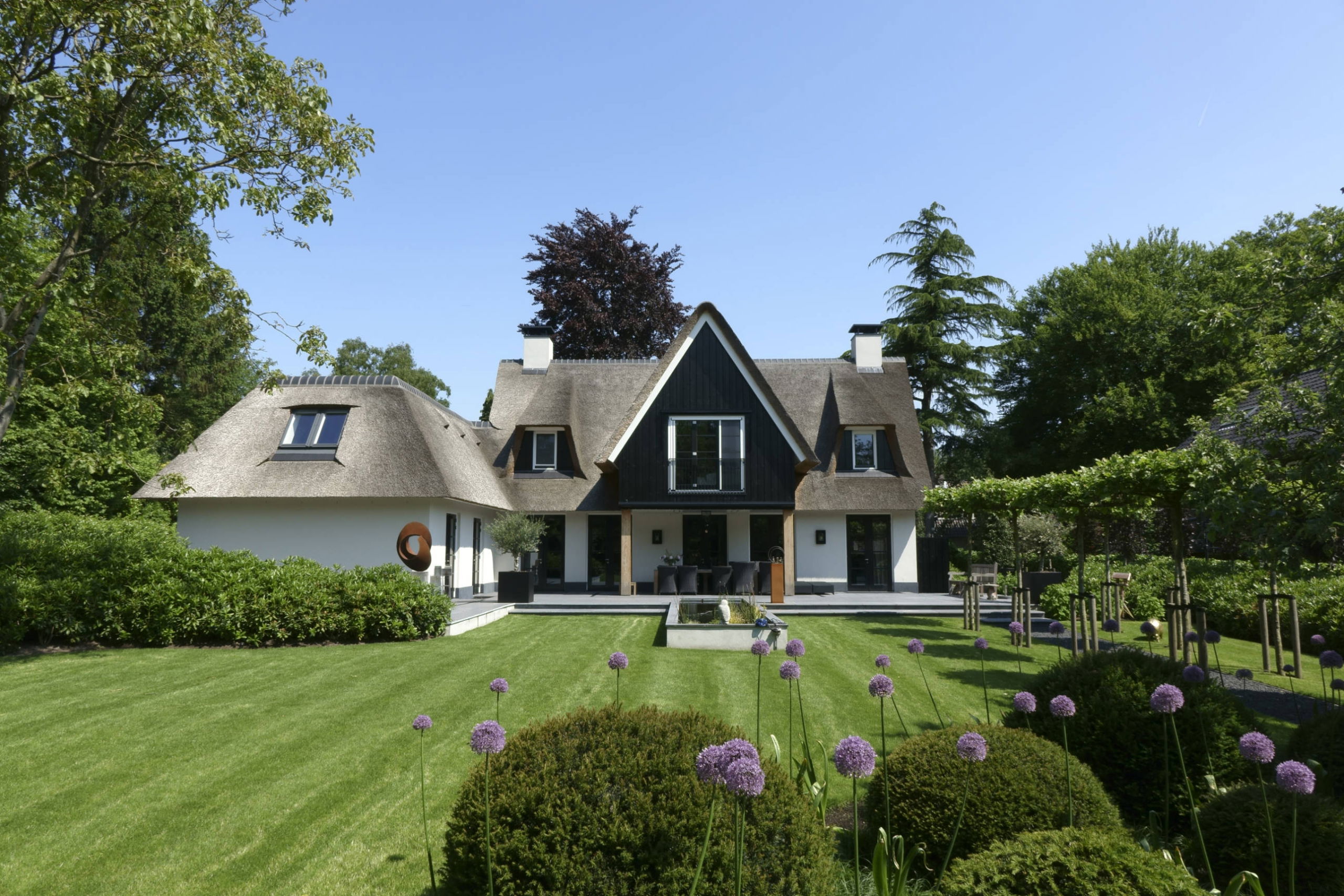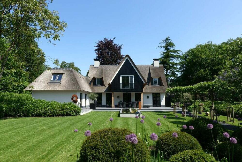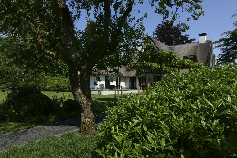 Bij de tuin van dit landelijke huis in Blaricum zijn klassieke stijlelementen gecombineerd met beeldbepalend groen en verrijkt met moderne elementen die precies aansluiten bij de levensstijl en levensfase van de bewoners. Hier is geen plaats voor uitbundig kleurenspel en ingewikkelde vormgeving.