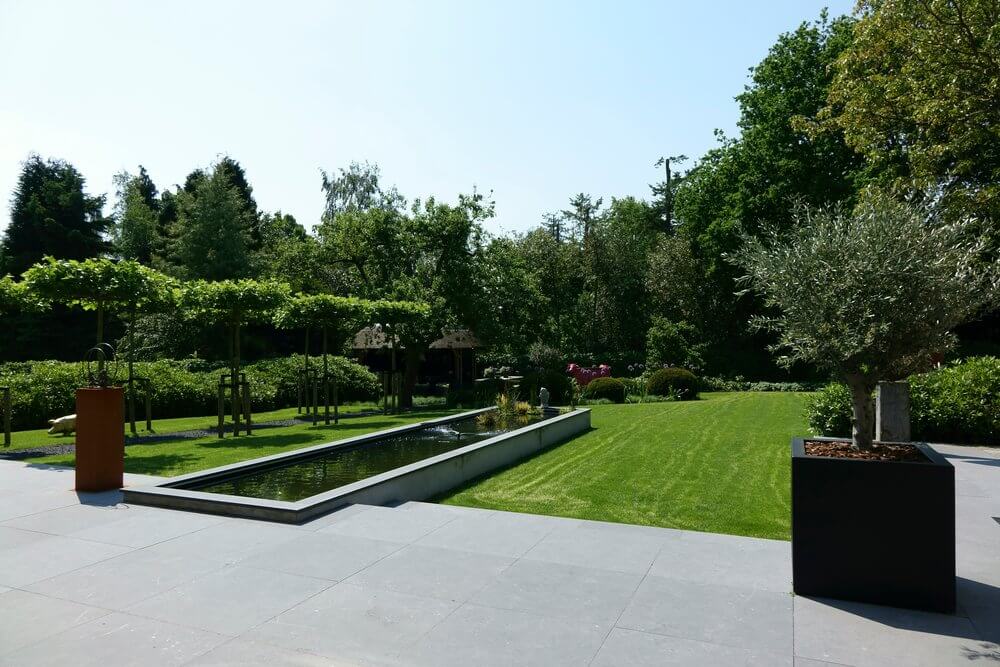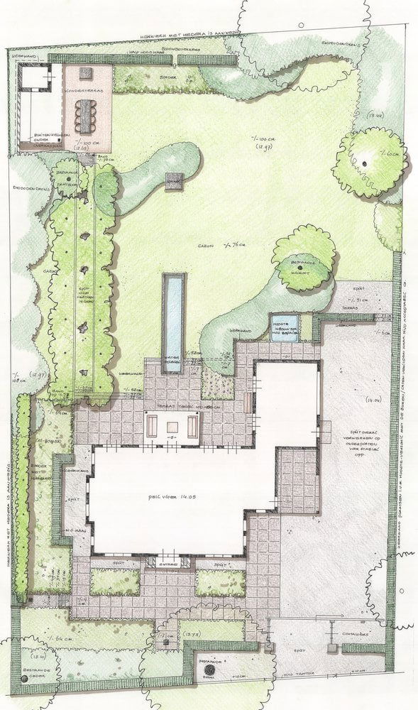 In de achtertuin is gewerkt met traptreden en keerelementen van beton om de hoogteverschillen in het kavel te overbruggen. Het langwerpige waterbassin is hier het verbindende element tussen de woning, tuinterrassen en tuin. Imposante hagen en passende beplanting omsluiten de intieme, gezellige terrassen rondom de woning wat zowel het eigen comfort en de privacy als dat van de buren garandeert. Op het einde van een statig dreefje dakplatanen ligt ‘het mannenterras’. De buitenkeuken en het meubilair versterken hier de mediterrane sfeer.