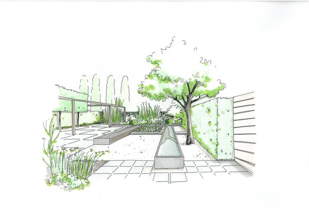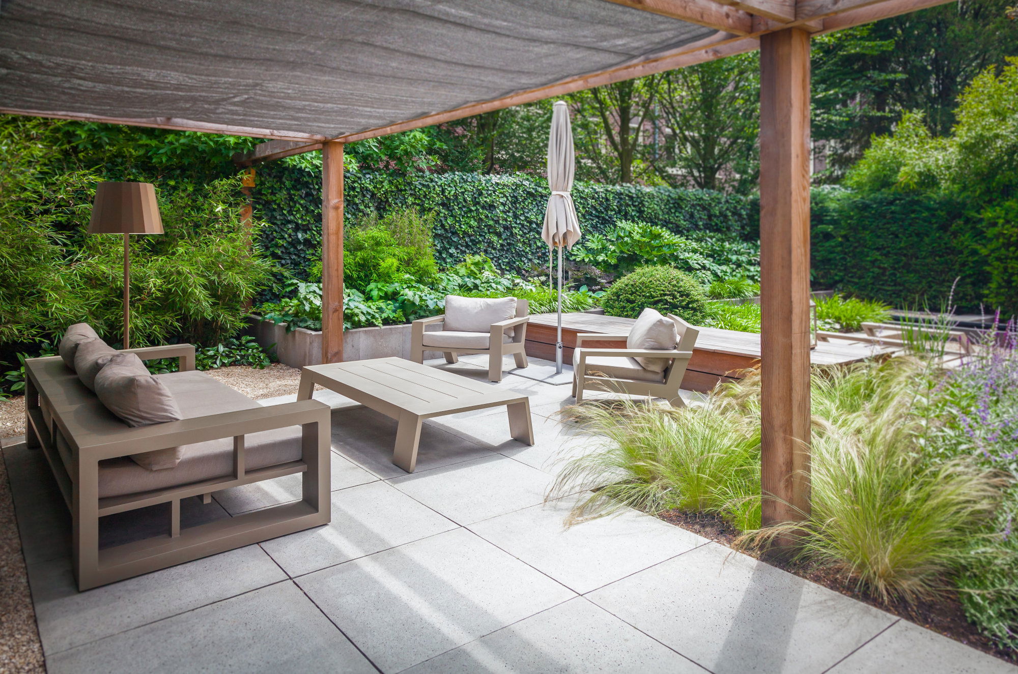 Er is gekozen voor overwegend stoere en onderhoudsvriendelijke beplanting, passend bij de grond en schaduwsituaties. De wintergroene Fatsia met attractief blad kan twee tot drie meter hoog worden. Ook de bamboe achterin de tuin mag de hoogte in gaan, net als de bomen van de achterburen. Tel daar de verdichte groene hagen en de pergola bij op: privacy gegarandeerd.