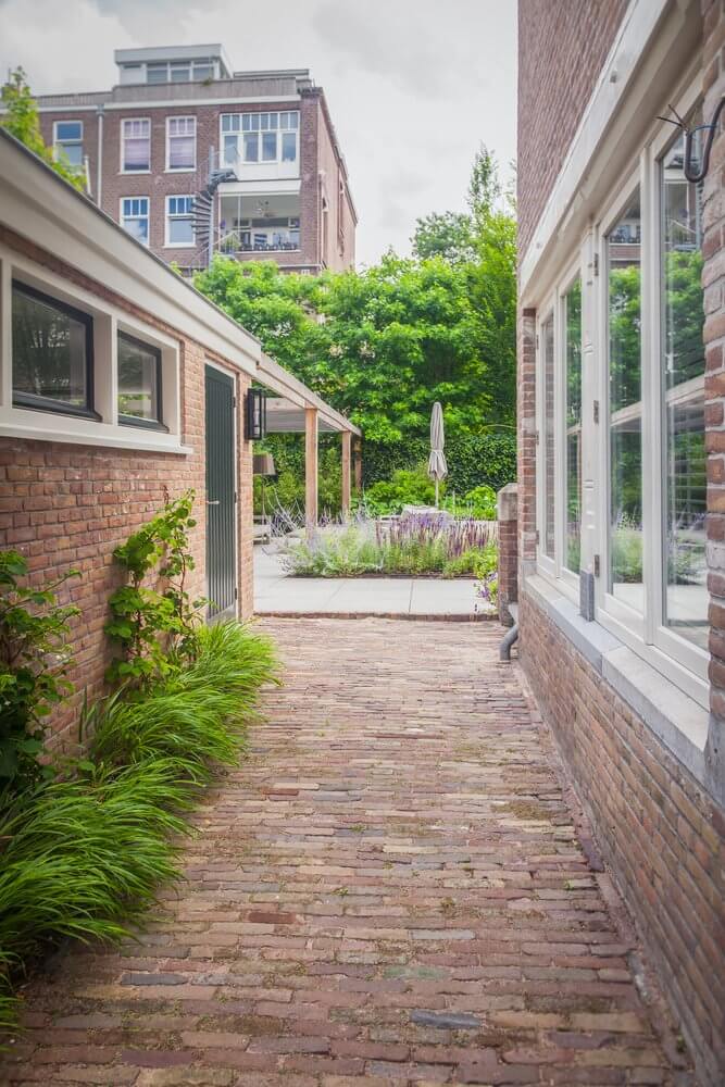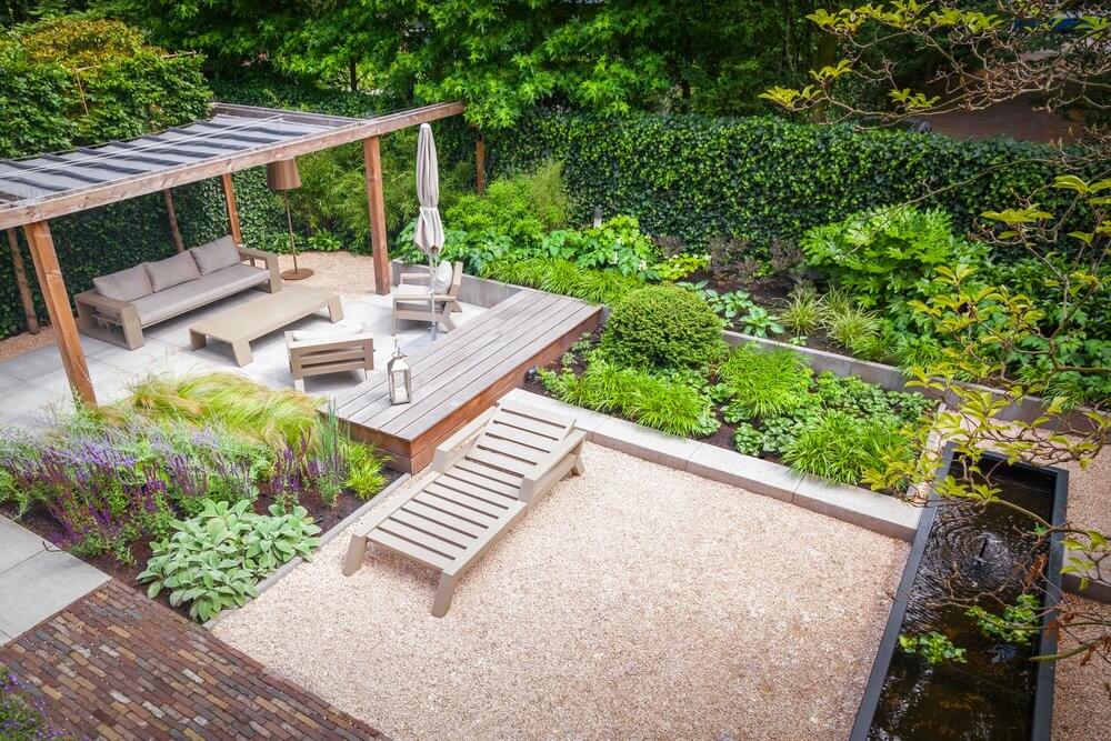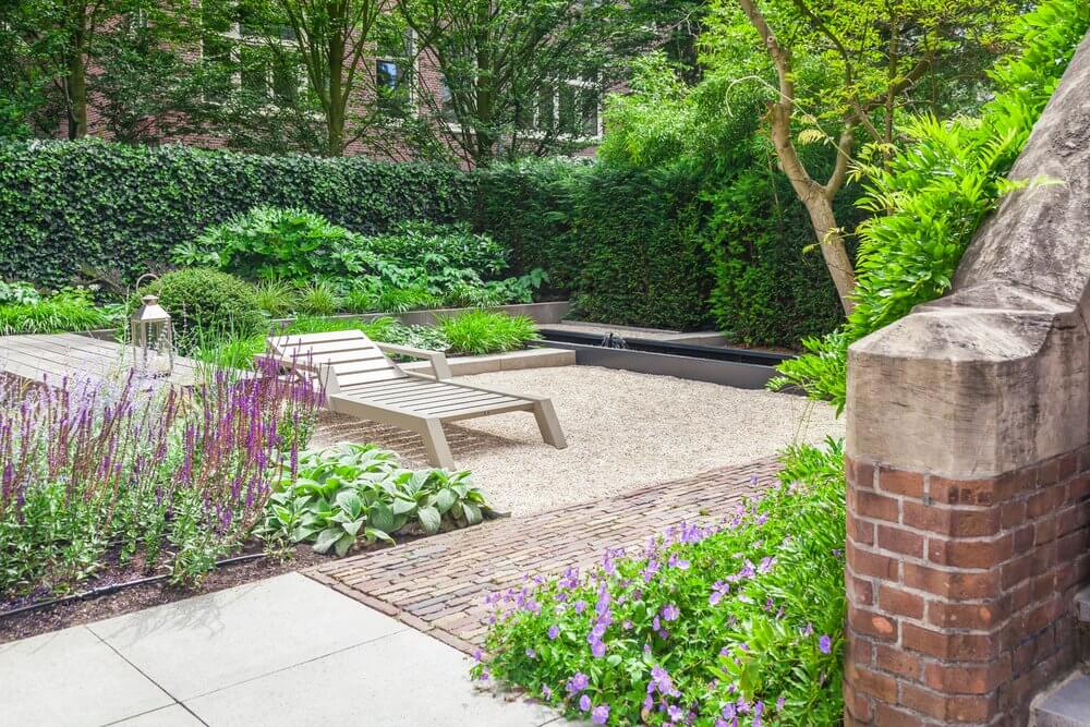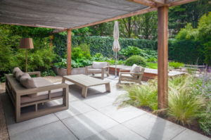 De bestrating is qua stijl een mix van oud en nieuw. Er liggen klinkers – die passen bij de uitstraling van het monumentale pand – in combinatie met moderne betontegels in grootformaat. Daarnaast hebben we ook grint toegepast, belangrijk voor de afvoer van regenwater. Andere in het oog springende zaken zijn de langwerpige vijver en het multifunctionele houten element. Het hoogteverschil geeft een extra dimensie aan de tuin. Naast de aanleg van deze stoere, eigentijdse tuin mochten we ook de tuininrichting met meubilair, tuinverlichting en beregening verzorgen.