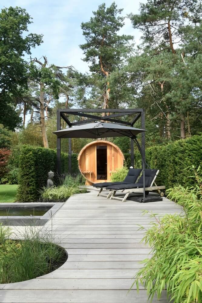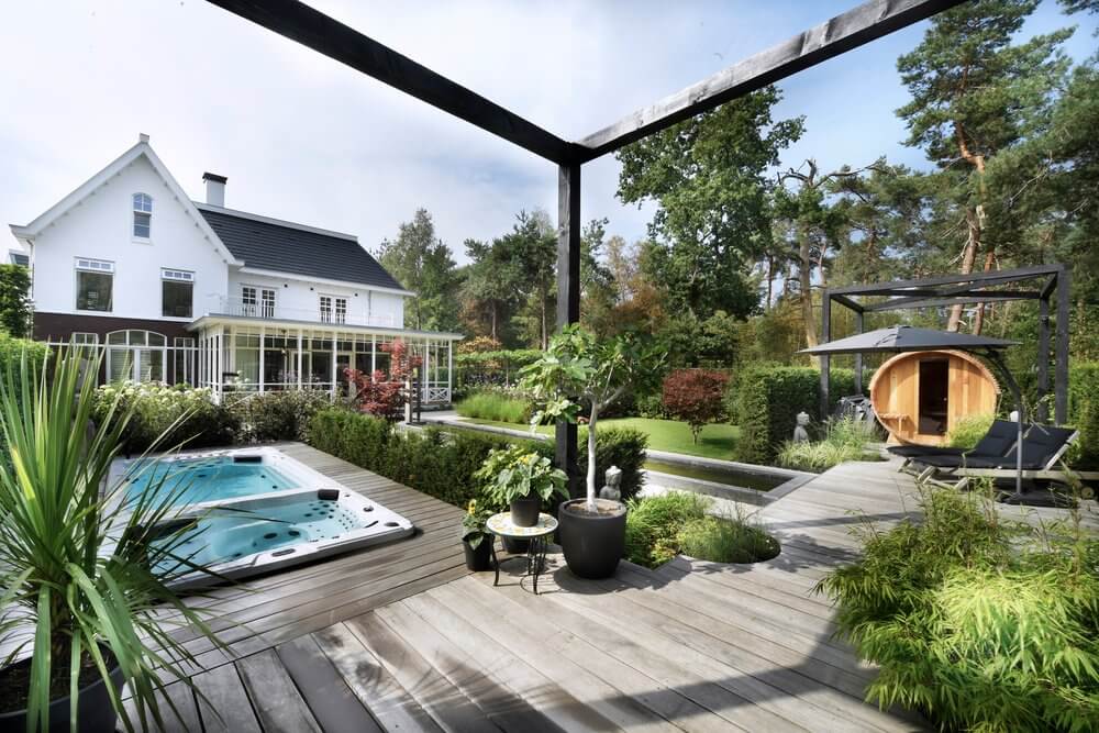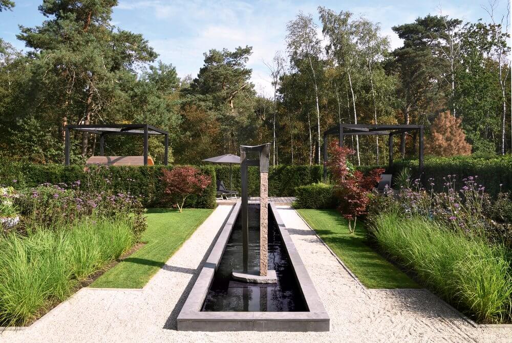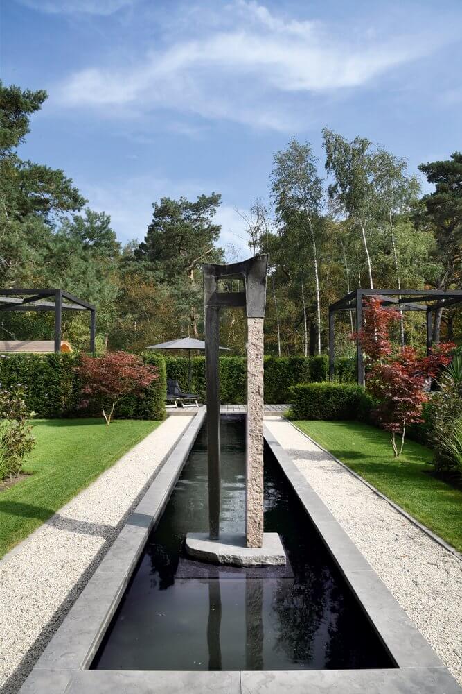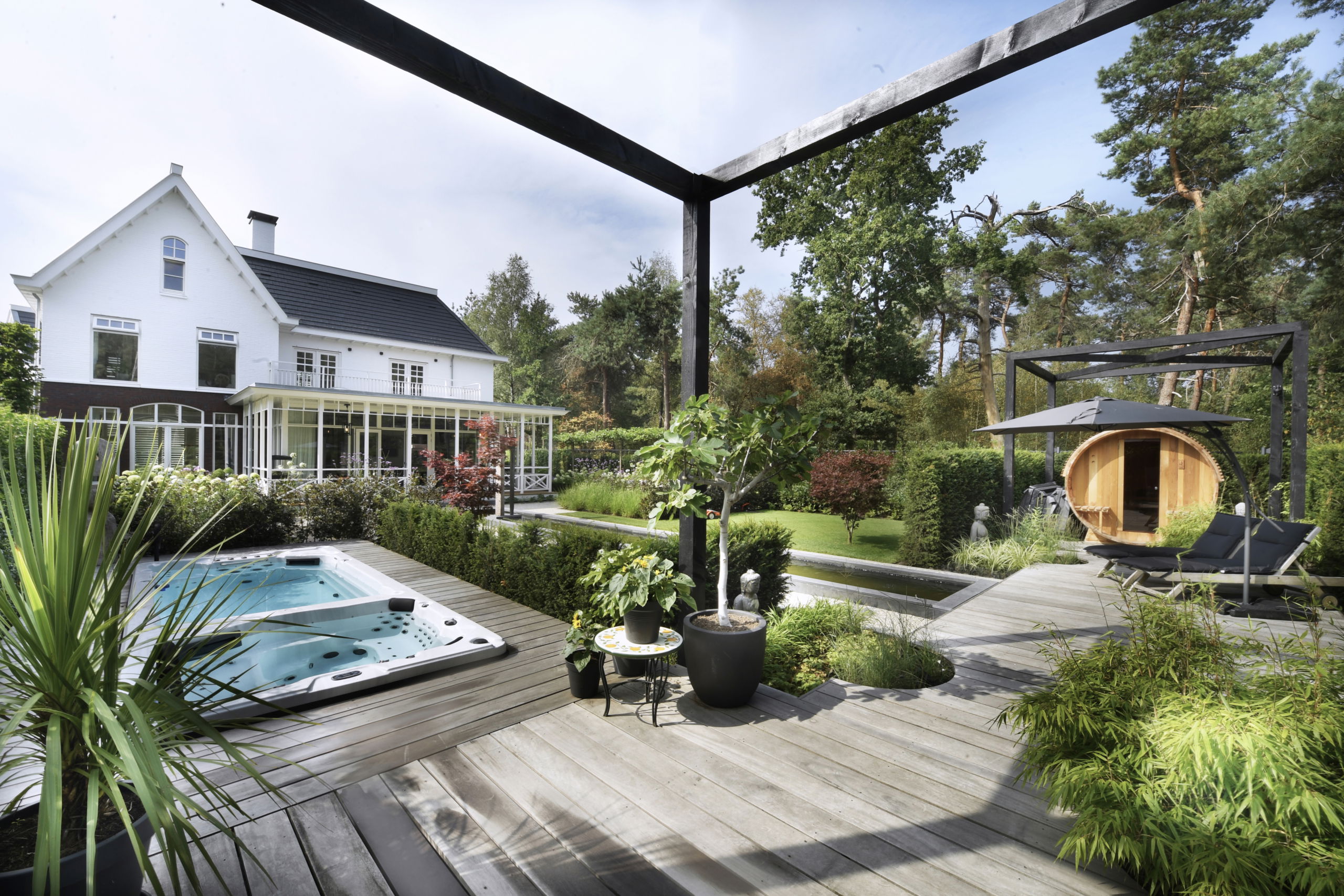 Bij de entree van de villa springen de gesnoeide vormbollen direct in het oog. Vanuit het huis en de veranda aan de achterzijde is er een prachtig uitzicht op de tuin en aangrenzende natuur. Kenmerkend voor deze tuin zijn de sterke zichtlijnen. Zo fungeert de strakke, langwerpige vijver – omsloten met een stenen rand en halfverharding – als water- en middenas. Aan het einde van de vijver vormt een houten vlonder de verbinding naar het wellnessgedeelte met Finse sauna, whirlpool en jacuzzi met twee hoge, houten bouwwerken. De hagen rondom de tuin vormen een duidelijke groene afscheiding. Binnen is de tuin, buiten is de natuur.