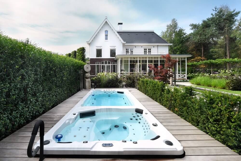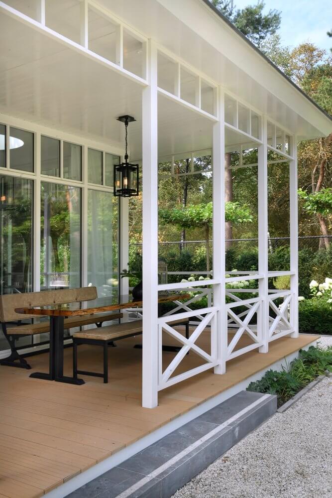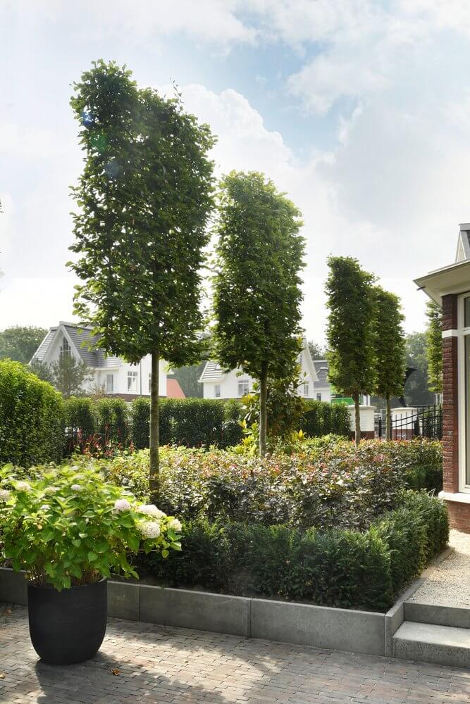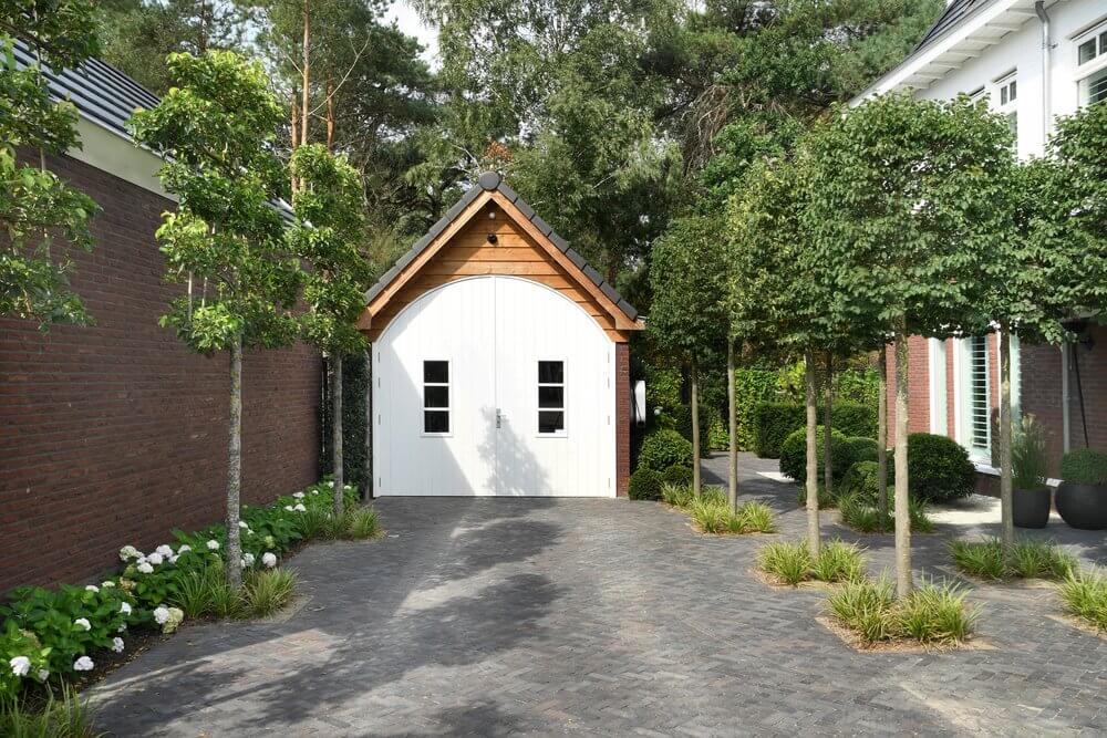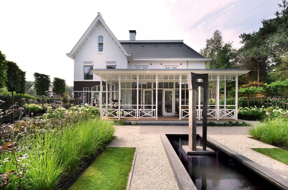 Bij de entree van de villa springen de gesnoeide vormbollen direct in het oog. Vanuit het huis en de veranda aan de achterzijde is er een prachtig uitzicht op de tuin en aangrenzende natuur. Kenmerkend voor deze tuin zijn de sterke zichtlijnen. Zo fungeert de strakke, langwerpige vijver – omsloten met een stenen rand en halfverharding – als water- en middenas. Aan het einde van de vijver vormt een houten vlonder de verbinding naar het wellnessgedeelte met Finse sauna, whirlpool en jacuzzi met twee hoge, houten bouwwerken. De hagen rondom de tuin vormen een duidelijke groene afscheiding. Binnen is de tuin, buiten is de natuur.