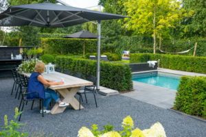 De ‘oude’ tuin is deze Almeerse eigenaren ontgroeid. Of andersom. Het is tijd voor een nieuwe invulling die beter aansluit bij de veranderde wensen en levensfase. In het plan is er gekozen voor één niveau direct aan het huis met traptreden naar het lager gelegen deel van de tuin en het zwembad, een vast element. Op het terras is plaats voor een fijne, grote tafel met stoelen onder een parasol. In de besloten chillhoek – op de plaats waar voorheen de speelhut stond – staat nu een trampoline. De draadloze speakers en wifi versterker maken de setting – tot groot genoegen van de kleinkinderen – compleet. Meer weten over deze tuin?
