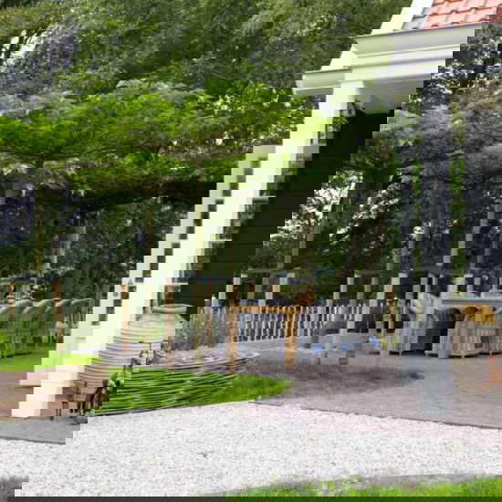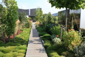 Wij waren het aanspreekpunt tijdens de ontwerpfase en hebben de tuin in zijn geheel aangelegd. Centraal in de tuin ligt de lange vlonder die fungeert als dieptelijn. Dat de tuin een landelijke uitstraling kreeg, zit ‘m vooral in de vele rijkbloeiende vaste planten en de bomen. Walnoot, tamme kastanje, berk en sierappel zijn bomen met een uitgesproken natuurlijke uitstraling. Net als de rij met sierlijke wilgen langs het graspad in de voortuin. Meer gecultiveerd zijn de Liquidambar – een amberboom met een spectaculaire herfstverkleuring – en de Liriodendron, een tulpenboom met een rijke voorjaarsbloei en een eveneens opvallende herfstverkleuring. In de beplanting vallen verder de vele siergrassen op, onmisbaar in een landelijke tuin. Daarnaast is er ruimte voor groenten en kruiden. Voor de heer des huizes is er een minigreen aangelegd.