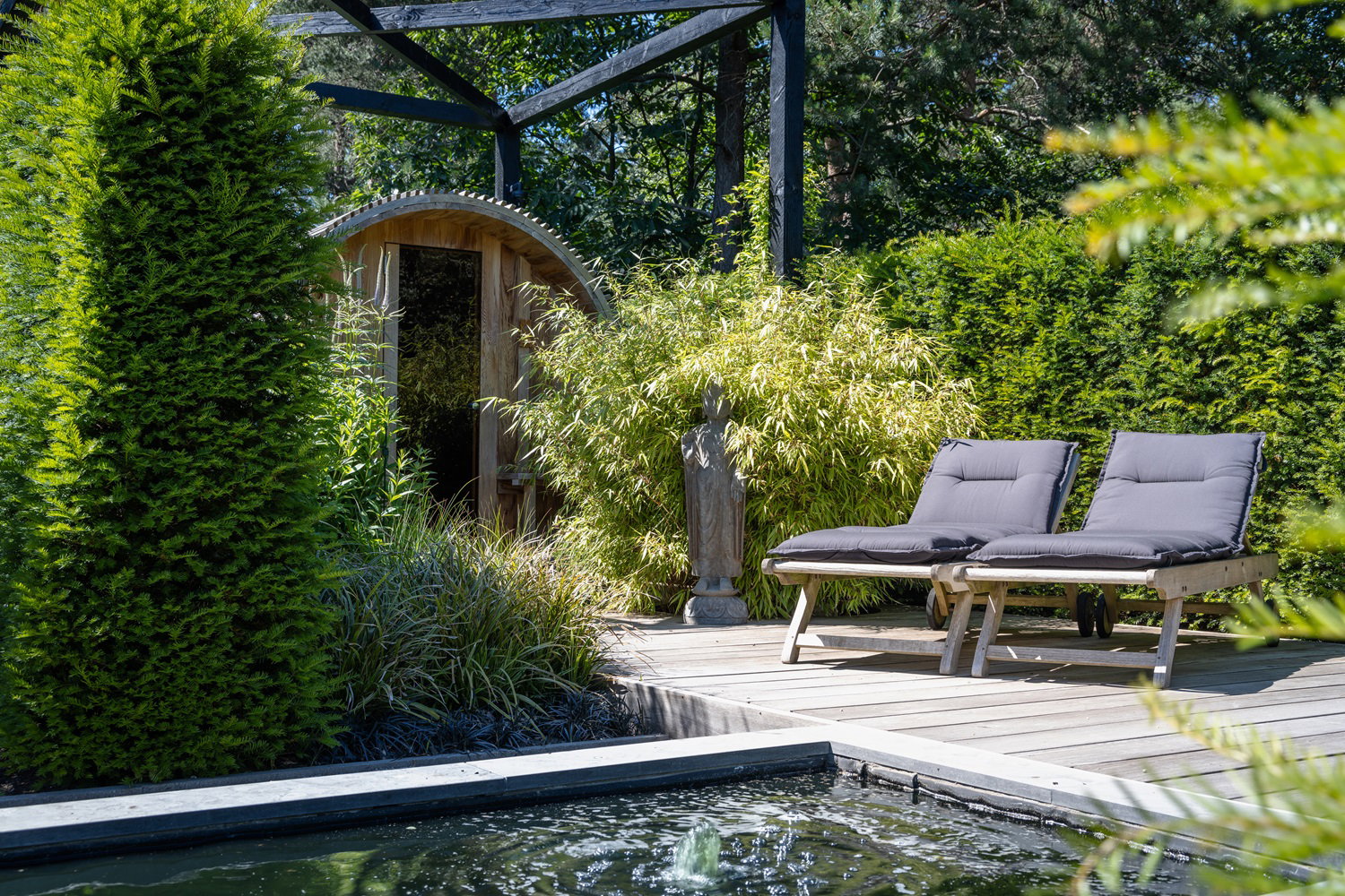 De natuur zorgt voor een rustgevende sfeer in de wellness tuin. Eventuele storende geluiden kunnen we minimaliseren door rustgevende geluiden te bevorderen. Met water en (wuivend) groencreëren we een oase van rust. U kunt er natuurlijk ook voor kiezen om fijne, rustgevende muziek af te spelen op de buitenboxen. Heerlijk bij het afkoelen na een saunasessie of tijdens het opdrogen na een rustgevend bad.