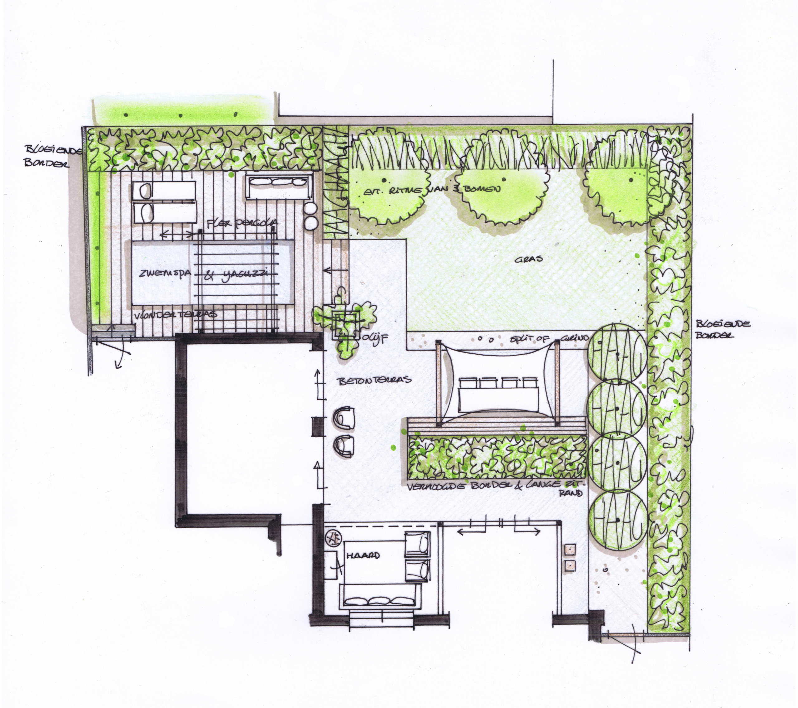 Bij uw tuinontwerp ontvangt u ook het bijbehorende inrichtingsplan van alle leefruimtes die zich in uw tuin bevinden, het beplantingsplan en (indien gewenst) het verlichtingsplan.